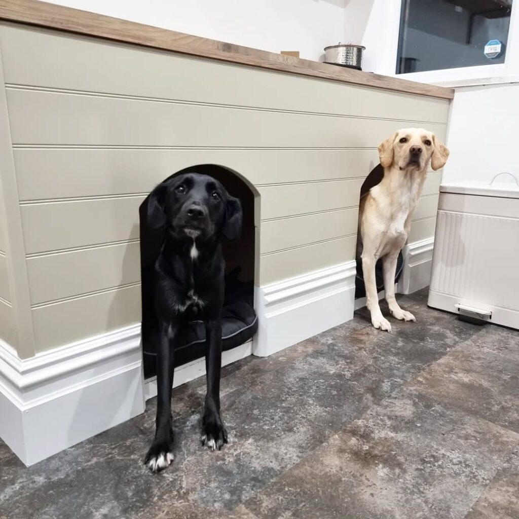 This brilliant design integrates the dog’s sleeping space seamlessly into the existing kitchen cabinetry, proving that pet zones can be both functional and stylish. Two dogs—a sleek black lab and a creamy yellow lab—are perfectly framed by the arched entrances under what appears to be a kitchen island or counter extension with a warm wood top. The neutral, shiplap-style cabinetry blends beautifully with the dark, slightly distressed flooring, creating a sophisticated and tidy look.