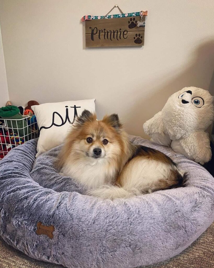 This sweet portrait shows a Pomeranian-mix dog lounging in a massive, ultra-plush, gray ombré donut bed that looks like a cloud. Above the bed hangs a personalized wooden sign that reads “Prinnie” with small paw-print details, clearly marking the space as hers. A decorative, embroidered “SIT” pillow and a large, white plush toy seal add to the cozy, pampered aesthetic.