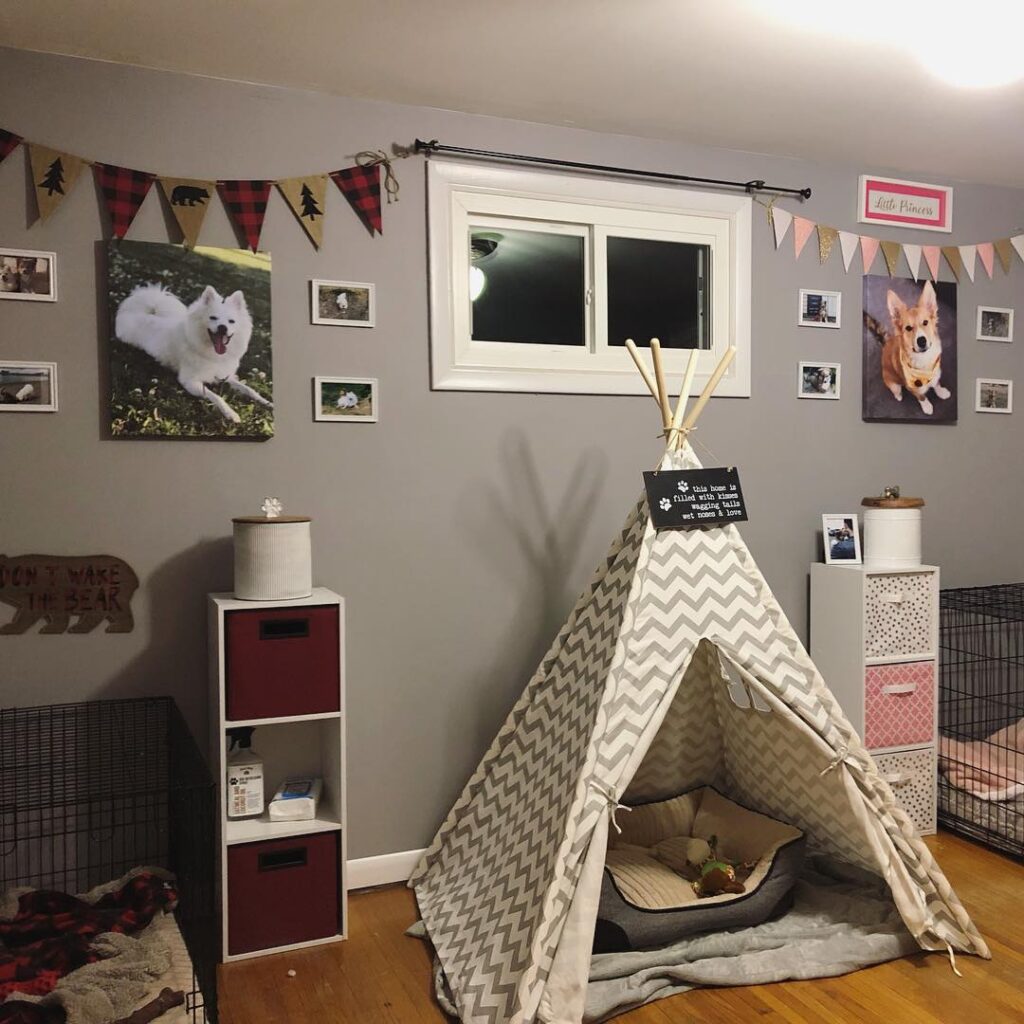 This adorable dog bedroom features a gray chevron-patterned teepee as the central sleeping area, surrounded by charming, personalized décor. The wall above the window is decorated with a mix of buffalo plaid and pink gingham banners, and the gray wall is covered with large canvas prints of the dogs alongside smaller framed photos. The crates are tucked neatly on the sides, dressed with cozy plaid blankets that tie into the rustic banner theme.