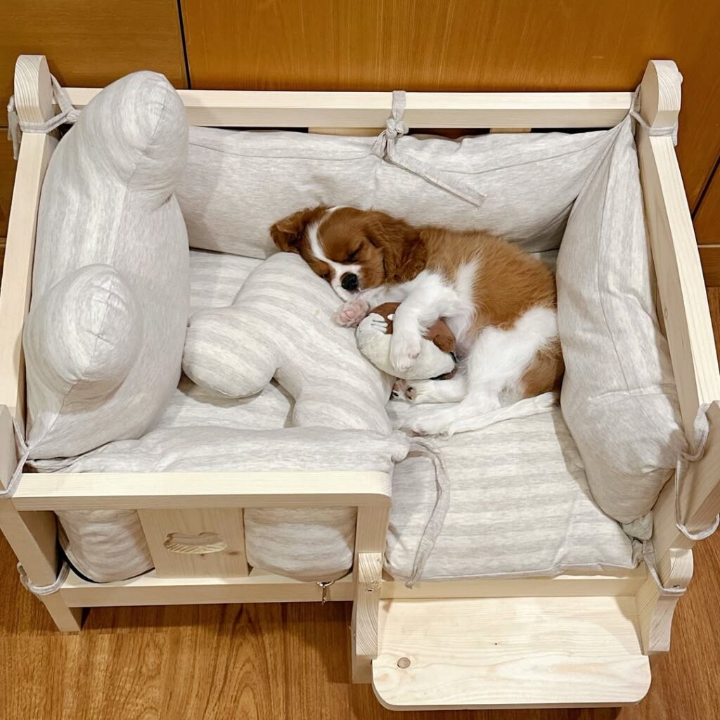 This photograph showcases a precious puppy—a Cavalier King Charles Spaniel—sound asleep in a beautifully crafted wooden pet crib. The light-colored wood structure features a removable ramp for easy access, and the interior is heavily cushioned with striped, neutral-colored pillows, including a bone-shaped one. This elevated bed structure gives the puppy its own secure, raised sleeping platform.