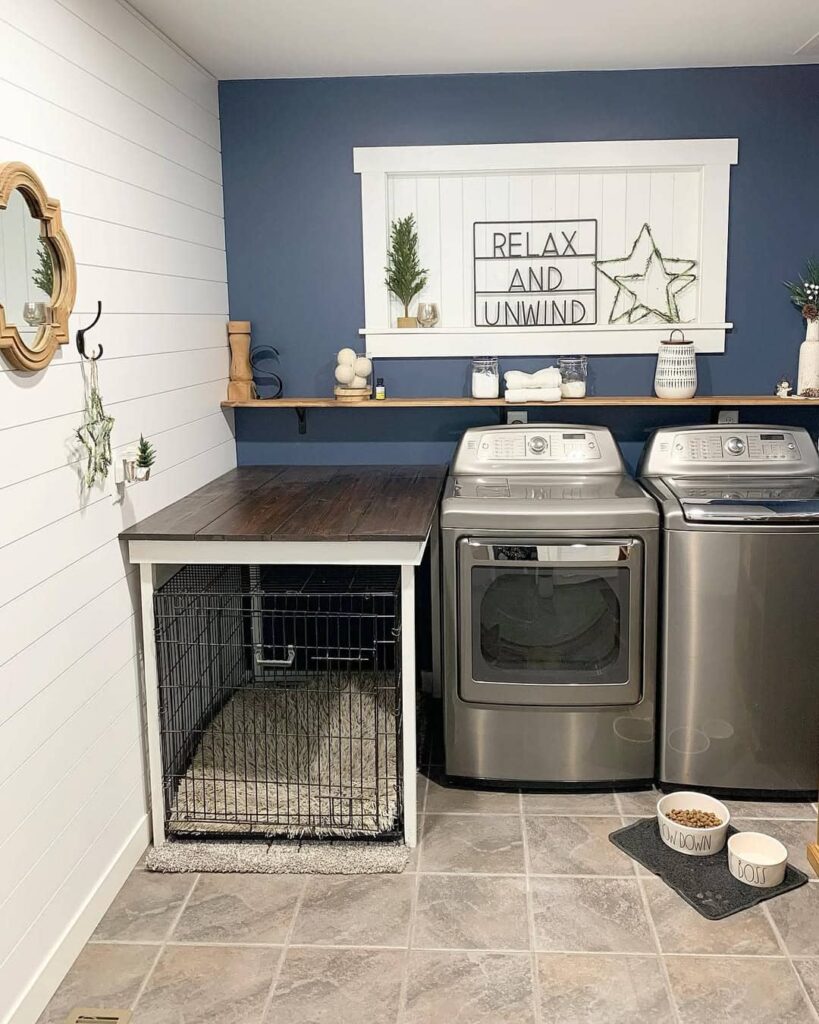 This genius idea incorporates a wire dog crate underneath a custom dark wood countertop, perfectly bridging the space between the washer and dryer units. The room features a striking navy blue accent wall paired with crisp white shiplap on the adjacent wall, giving it a modern farmhouse aesthetic. The countertop provides a convenient folding station, while a long shelf above the machines holds decorative items and dog supplies.