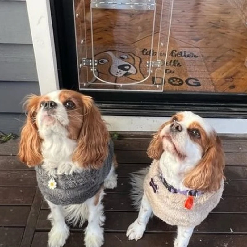 Two adorable Spaniels in cozy sweaters sit on a deck in front of a clear pet door that reveals a “Life is better with a dog” mat inside. The transparent flap is hinged at the top and framed with slim hardware that keeps the focus on the pups and the decor.