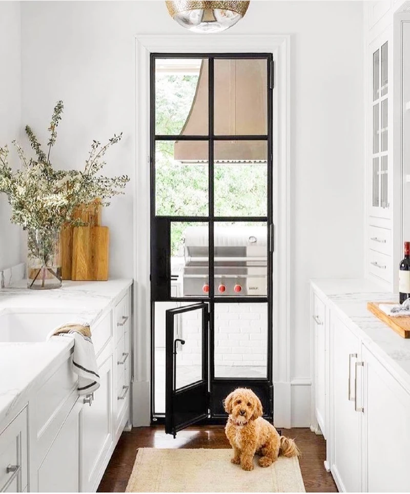 A stunning white kitchen features a black-framed French door with a custom-fitted pet door at the bottom that matches the window panes. A small brown pup sits on a neutral runner rug right in front of the exit which blends perfectly with the room’s high-end design.