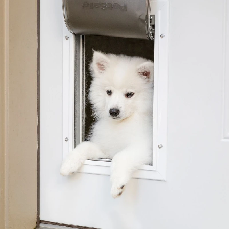 A pristine white door features a high-quality pet door insert with a thick grey flexible flap held open by a fluffy white puppy. The frame is clean and modern with visible silver screws that ensure a tight and secure fit against the door’s surface.