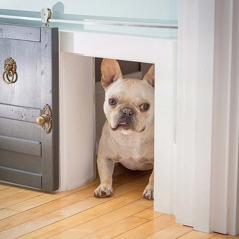 A French Bulldog peers through a small rectangular opening in a white wall that is flanked by a tiny dark grey sliding barn door. The miniature door is equipped with an ornate brass lion head knocker and a vintage-style handle making it look like a piece of art.