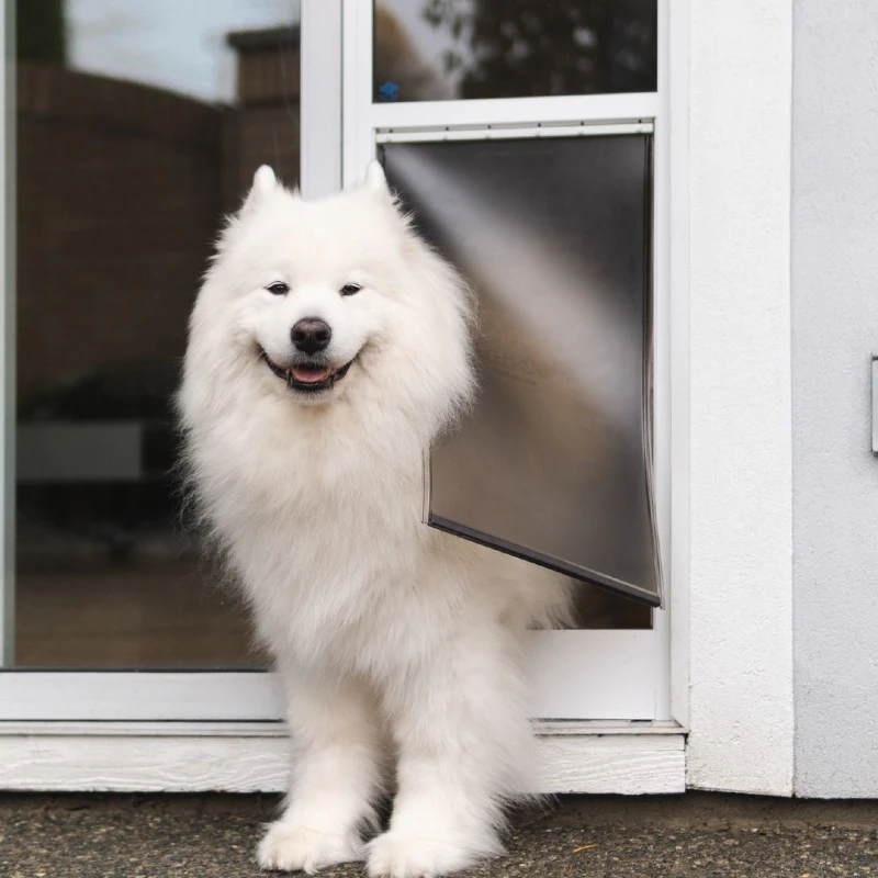 A majestic white Samoyed stands proudly next to a large tinted flexible flap that is part of a removable white frame insert for a sliding door. The flap is partially translucent which provides a bit of privacy while still letting the dog see what is happening on the other side.