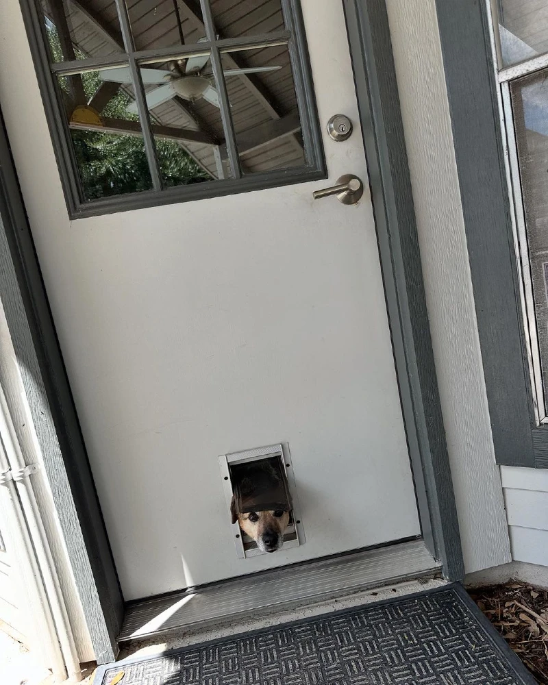 The energy is quirky and delightful turning a simple pet pass-through into a conversation piece. It feels like a home where the owners have a great sense of humor and a deep love for their pet’s unique personality.