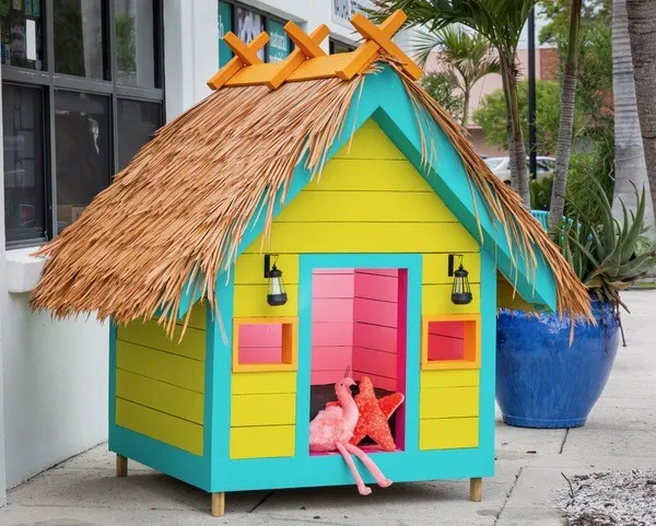 If you want to give your dog a special retreat, a beach hut-inspired dog house is a fun and colorful option. This design captures the essence of a seaside getaway with its bright colors and playful details.