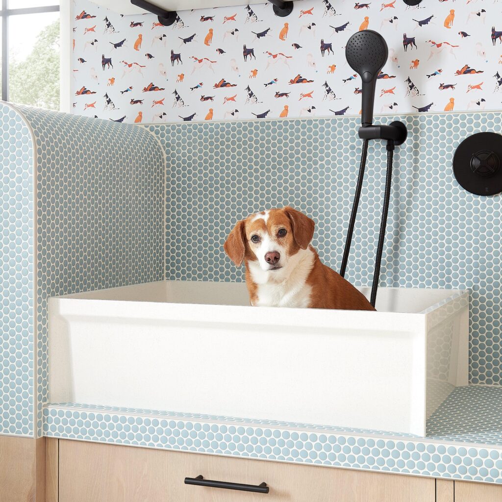 The flooring appears to be a stylish tile that can handle spills and muddy paws without showing wear. Choosing slip-resistant tiles adds safety for both you and your pet during bath time. The walls are tiled as well, which helps in keeping the area clean and hygienic.