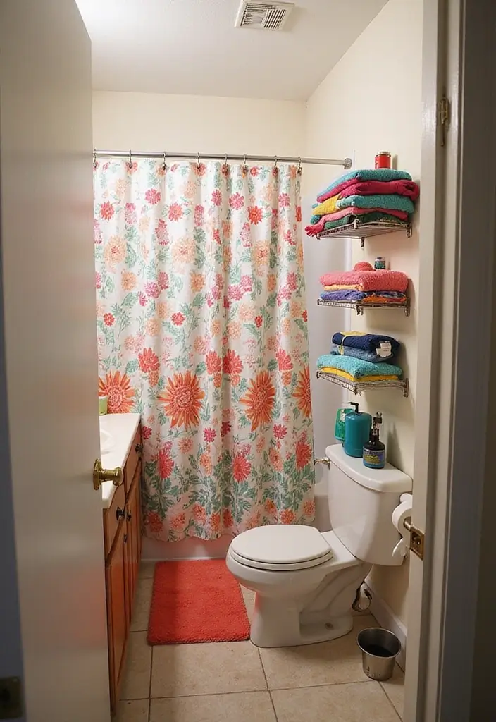 A vibrant shower curtain with a large orange and pink floral print dominates the room, paired with matching colorful towels on wall racks. The bright coral bath mat on the floor completes the high-energy look.