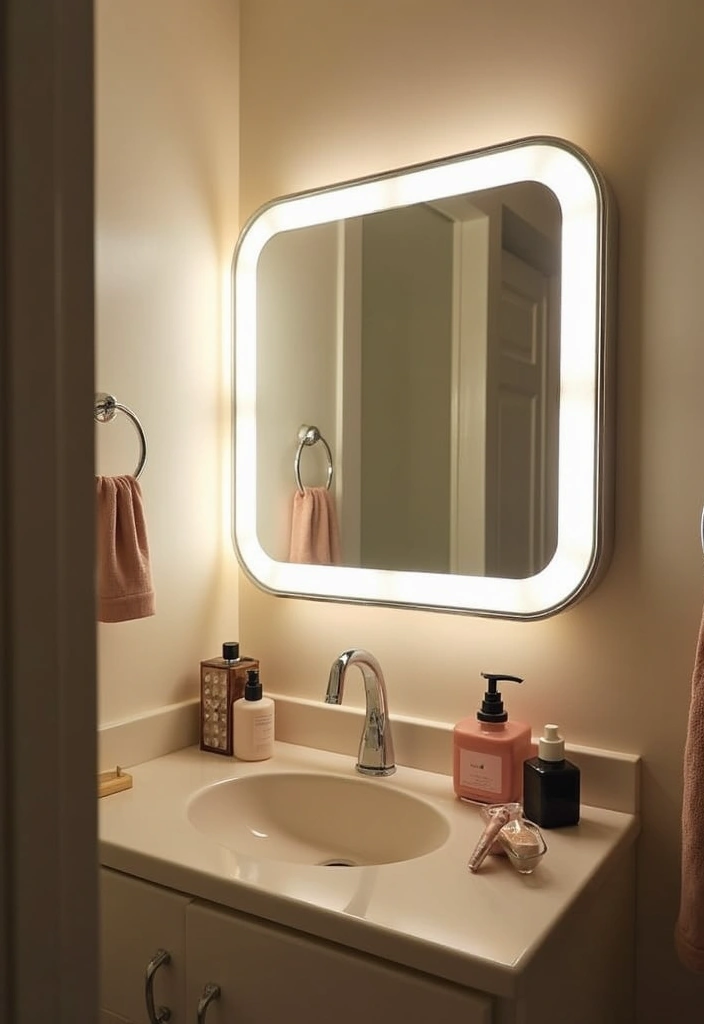 A large, rounded-square mirror with a built-in LED light border hangs above a clean white vanity. The soft glow illuminates the sink area, highlighting pink and black soap dispensers.