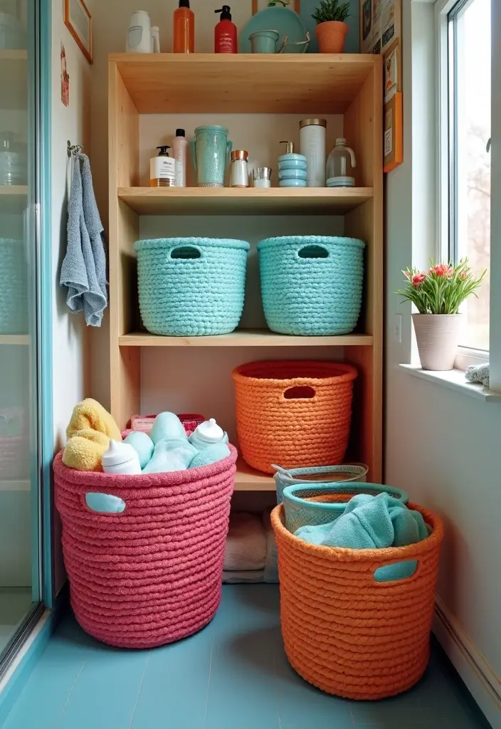 The visual appeal comes from the chunky, tactile texture of the baskets and the bright, happy color palette. It hides clutter while adding a cozy, soft element to the room.