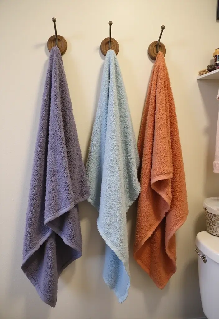 Three plush towels in lavender, light blue, and terracotta hang from wooden wall hooks in a neat row. The colors are muted and earthy, providing a soft contrast to the white wall.