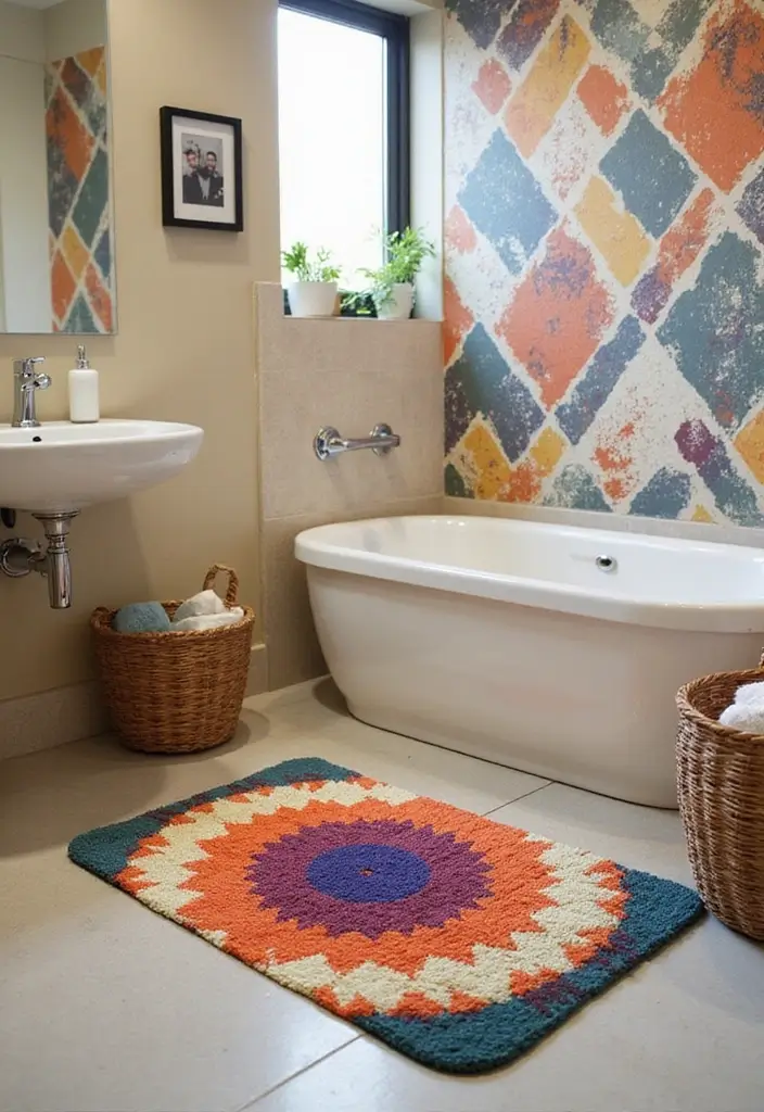 A bold, sunburst-patterned rug in shades of orange, purple, and teal sits on a neutral tile floor next to a white bathtub. The wall features a matching harlequin diamond pattern in similar earthy and bright tones.