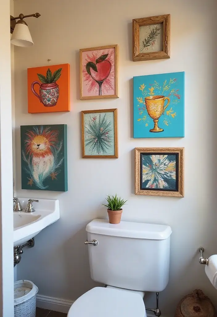 A collection of small, colorful framed art pieces is arranged in a gallery style on the wall above a white toilet. The art features botanical and abstract themes in vibrant oranges, blues, and pinks.