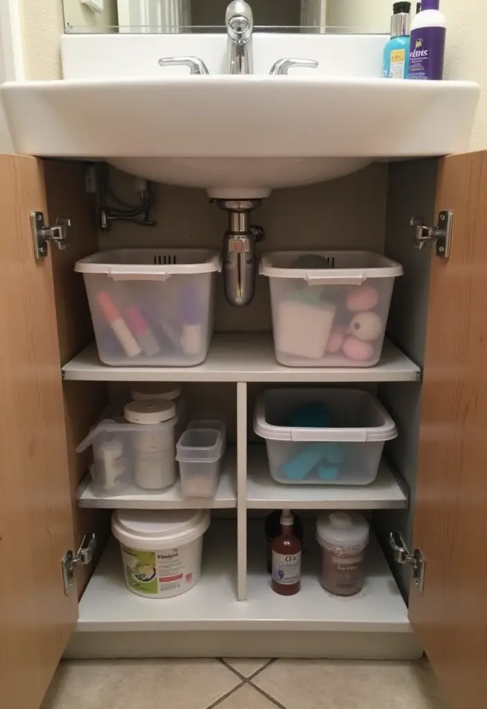 This image shows a perfectly organized under-sink cabinet featuring clear plastic bins on white shelving units. Each container is filled with specific categories of items like makeup sponges and skincare bottles to maximize the limited footprint.