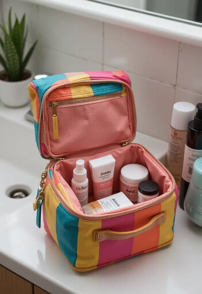 A vibrant, multi-colored striped makeup bag sits open on a clean white countertop, overflowing with aesthetic skincare products. The bag features bright shades of pink, yellow, teal, and orange with a sturdy gold zipper.