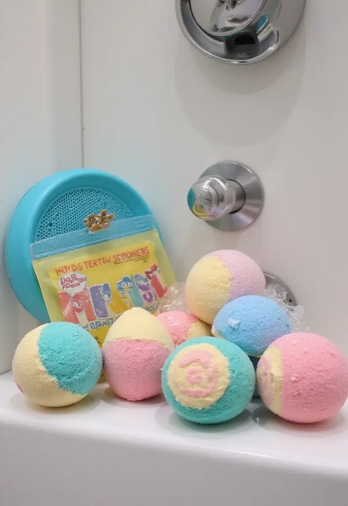 This photo captures a collection of pastel-colored bath bombs piled neatly next to a bright teal waterproof speaker. The bath bombs come in soft shades of pink, yellow, and blue, creating a sweet and inviting scene.