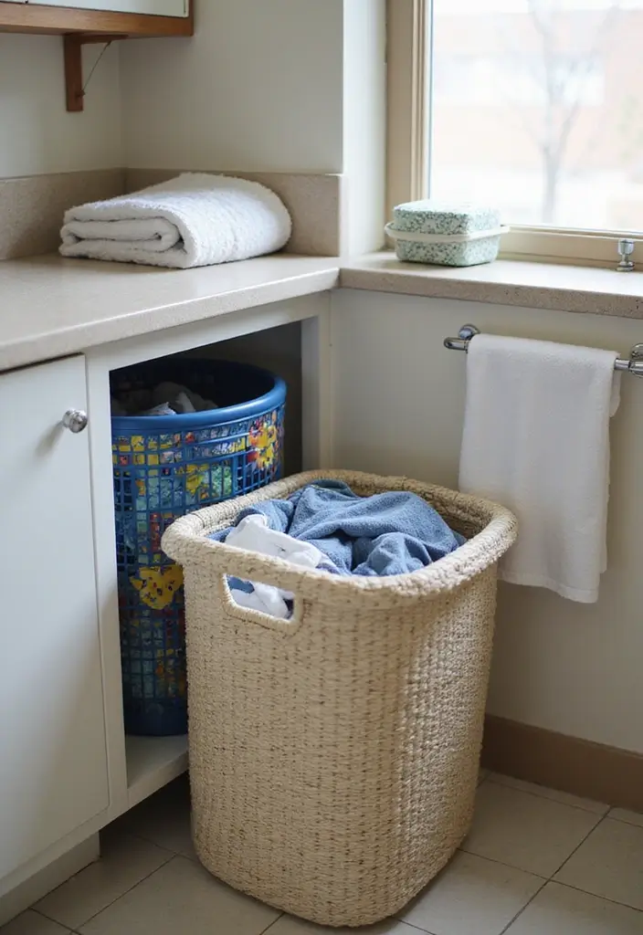 A woven wicker laundry hamper sits on the floor next to a blue plastic basket tucked into a cabinet nook. White towels are neatly folded on the counter above, creating a functional cleaning station.