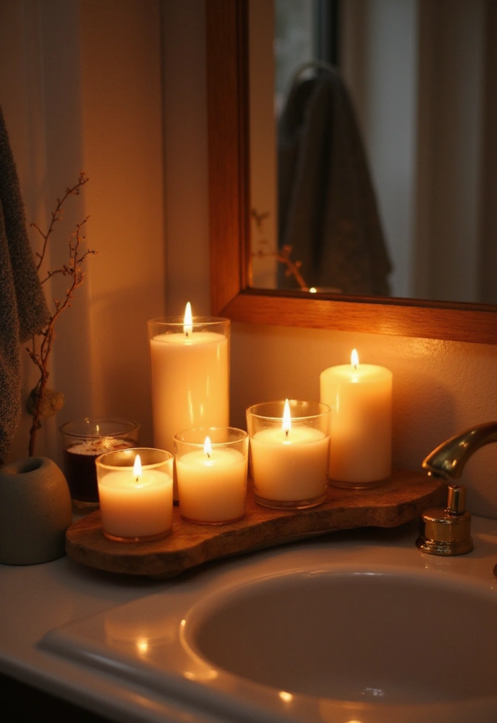 A series of glowing white candles in glass jars are arranged on a rustic wooden base near a bathroom sink. The warm light reflects off the mirror and the gold faucet, creating a soft and hazy atmosphere.