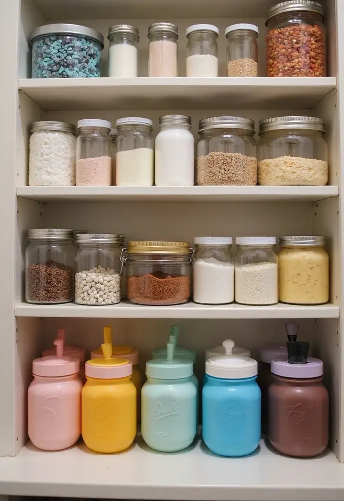 This works visually because the repetition of the jar shapes creates a clean, cohesive look that hides the “visual noise” of mismatched packaging. It turns everyday supplies into a curated collection.