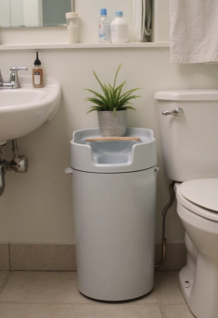 A tall, slender white trash can with a lidded top sits tucked between a pedestal sink and a toilet. A small potted plant is placed on top of the lid to add a decorative touch.