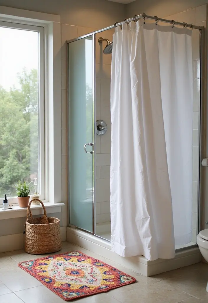 A glass-enclosed walk-in shower features a crisp white curtain and chrome fixtures, situated next to a large window. A bright, patterned rug and a large woven basket on the floor add texture and color.