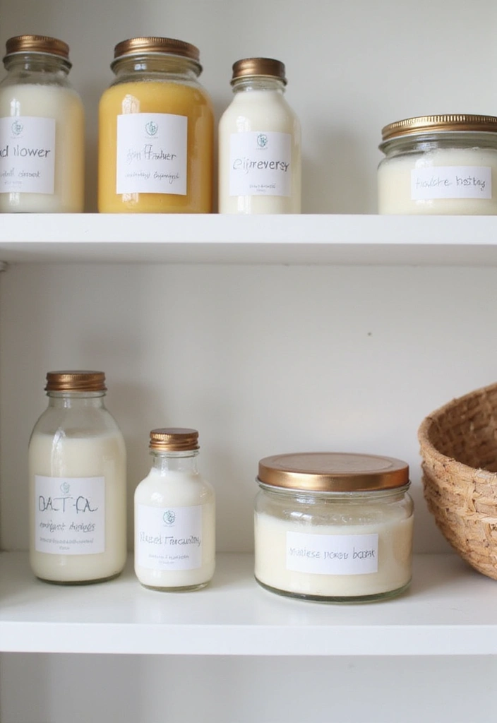 Two simple white shelves hold a collection of glass milk jars and wide-mouth jars with metallic gold lids. Each jar has a clean white label and contains creamy white or golden bath products.