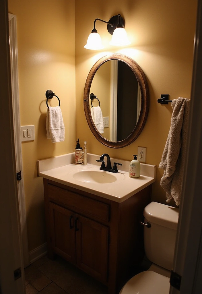 An oval wooden-framed mirror is centered on a warm yellow wall, flanked by a classic black light fixture and towel ring. A wooden vanity cabinet provides a sturdy, traditional base for the white countertop.