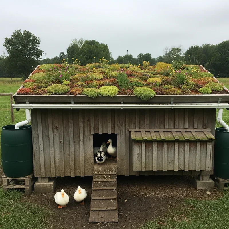 If you’re considering building a duck house that blends with nature, an eco-friendly green roof design is a fantastic option. The image showcases a charming duck house with a lush green roof, covered in moss and small plants. This not only looks inviting but also offers numerous benefits.