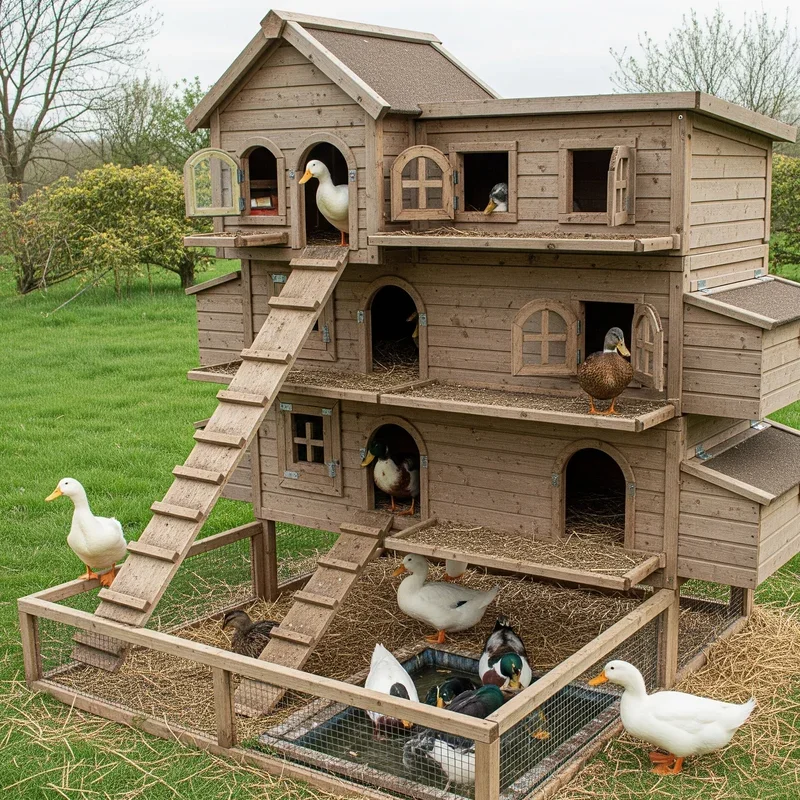 The structure showcases a multi-level design, making it a space-efficient option for small yards or balcony settings. Each level is thoughtfully laid out, providing ample space for ducks to roam, nest, and relax.