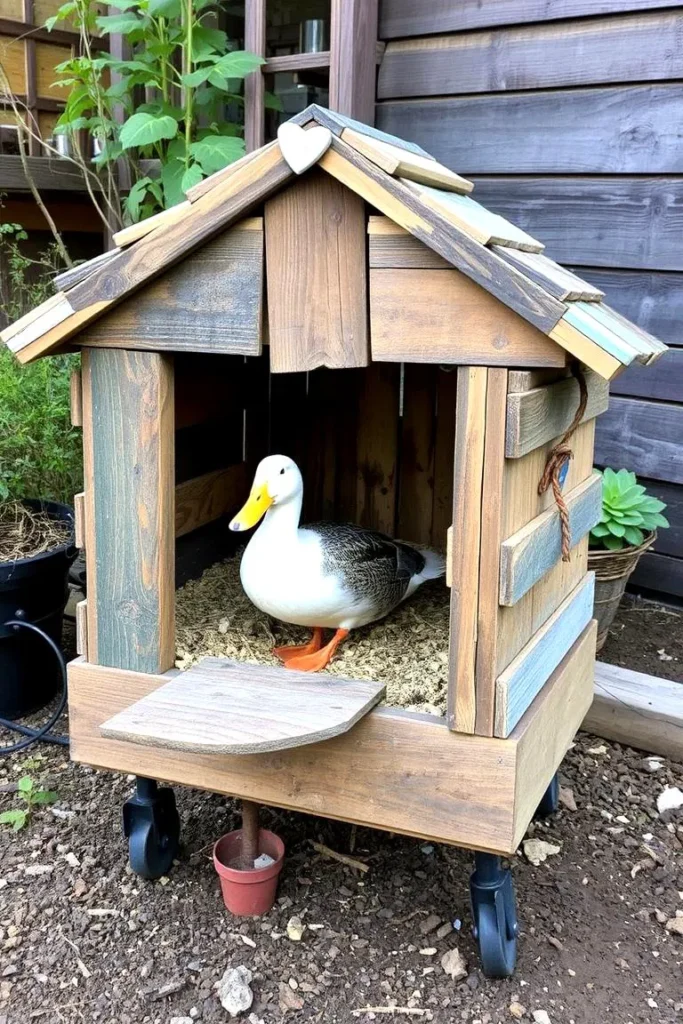 When you have a flock of ducks, a portable duck house can be a real asset. Imagine being able to move your feathered friends to fresh pasture whenever you want. This image showcases a charming wooden duck house on wheels, making it easy to relocate.