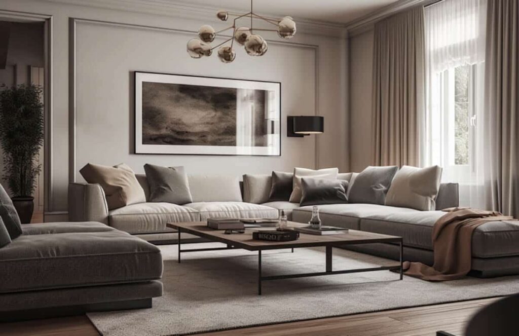 This space showcases a stunning low-profile sectional in a soft slate gray that anchors the entire room. Large-scale abstract art and a modern, spindly light fixture provide the perfect focal points without cluttering the visual field.