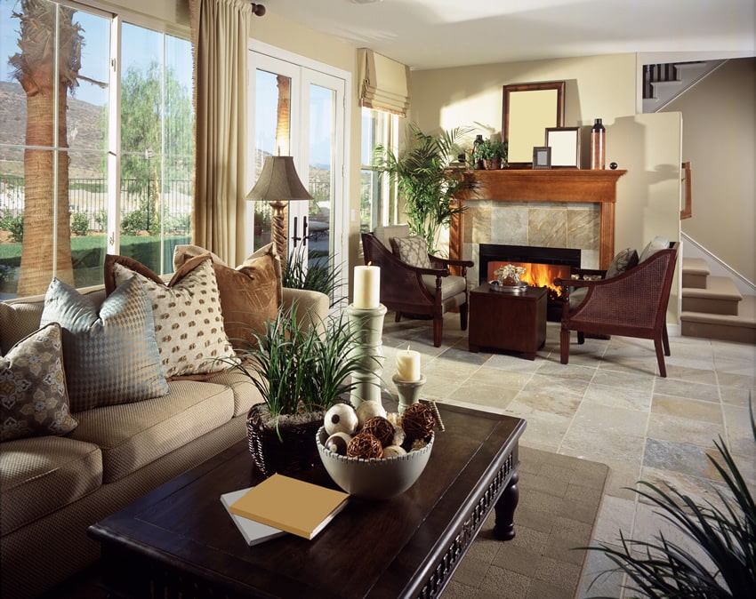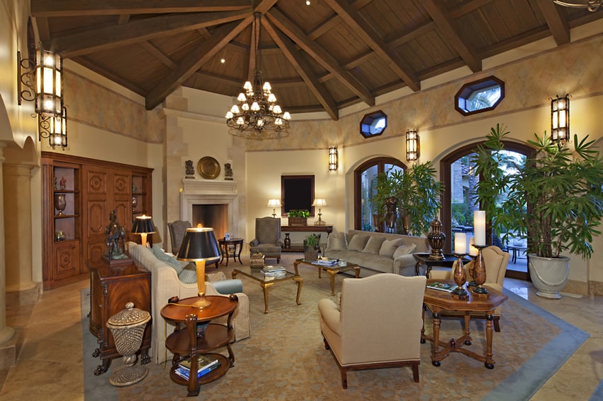 Warm limestone tiles and a classic wooden mantel create a Mediterranean-inspired backdrop for this light-filled room. French doors lead out to a sunny patio, while palm trees visible through the glass add a tropical, high-end resort feel.