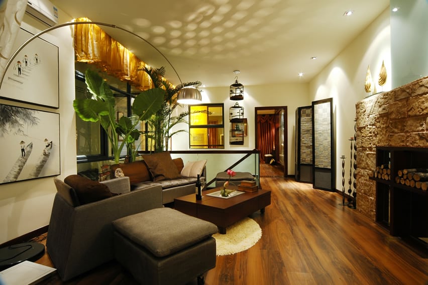This room utilizes a rich wood floor and a textured stone feature wall to create a cozy, slightly edgy atmosphere. An oversized arc lamp hangs gracefully over a low-slung gray sectional, while a dark wood coffee table holds minimalist decor.