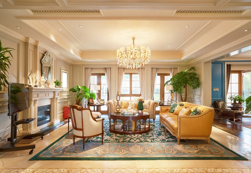 This room is the definition of opulence, featuring a magnificent crystal chandelier and a stunning green and gold patterned rug. Traditional tufted sofas in cream and ochre yellow sit opposite a stately white fireplace with a decorative silver mirror.