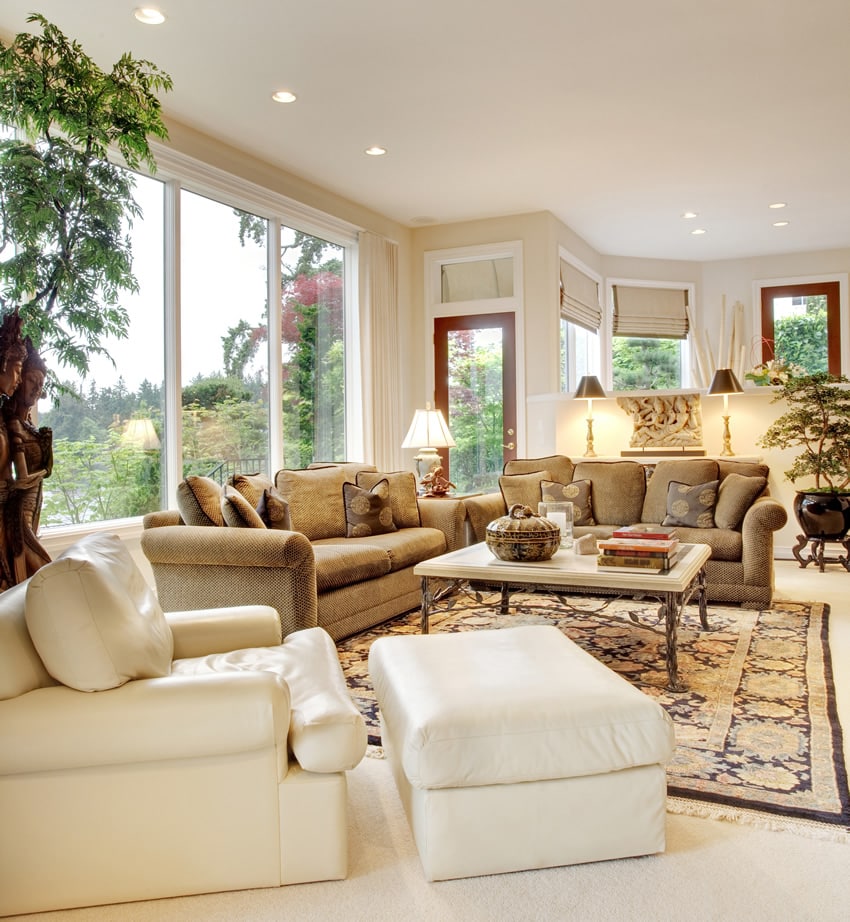 Large picture windows frame a lush outdoor view, acting as living art for this comfortable, beige-toned room. A mix of leather and fabric seating provides plenty of room for guests, while a large oriental rug ties the earth tones together.