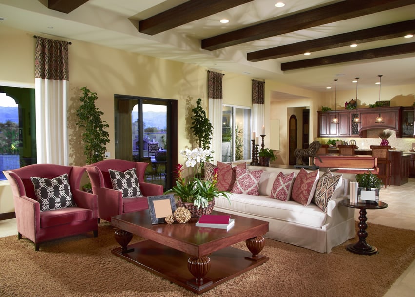 Deep berry-red velvet armchairs provide a stunning pop of color against the creamy walls and dark ceiling beams. A large, chunky wood coffee table and a plush shag rug add layers of tactile comfort to the expansive layout.