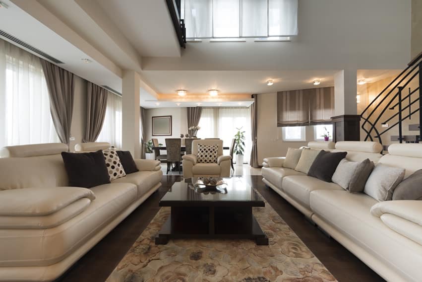 Luxurious cream leather sofas with adjustable headrests define this ultra-modern, open-concept space. The dark wood floors and a low-profile coffee table contrast sharply with the light upholstery and the soaring, bright ceilings.