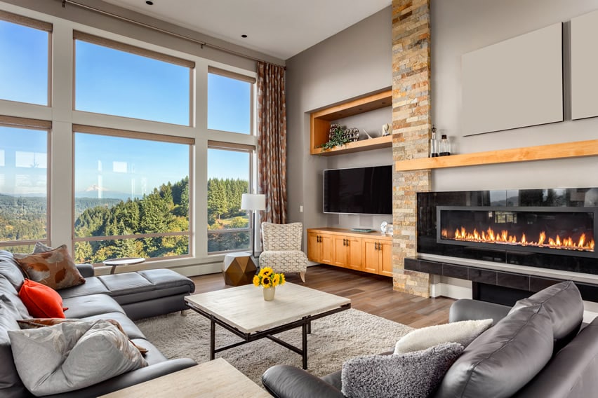 This room features massive windows overlooking a forest, with a modern linear fireplace set into a tall stone chimney breast. Sleek gray leather sectionals and a simple white coffee table keep the focus on the incredible natural scenery outside.