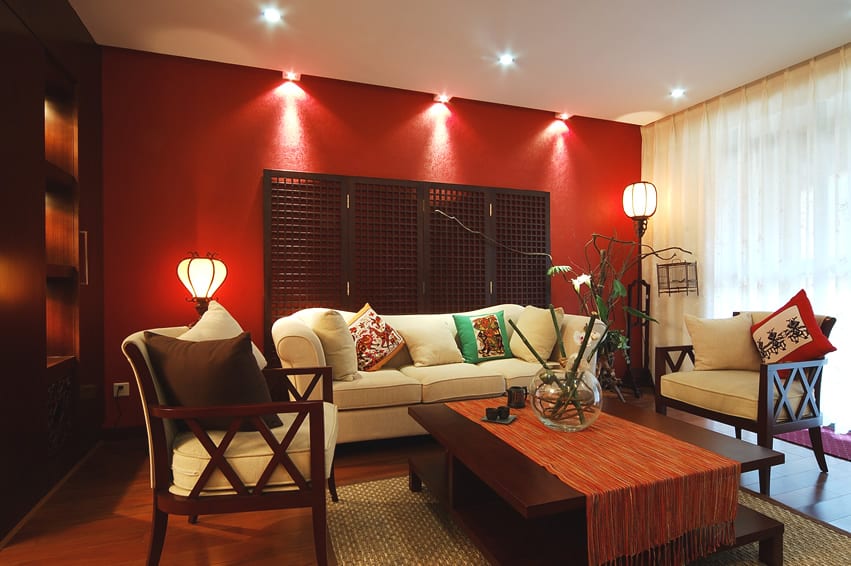 A bold crimson-red accent wall and a dark wooden room divider create a dramatic, East-Asian inspired aesthetic. Warm, glowing lanterns and silk-covered pillows with traditional embroidery add layers of authentic cultural detail.