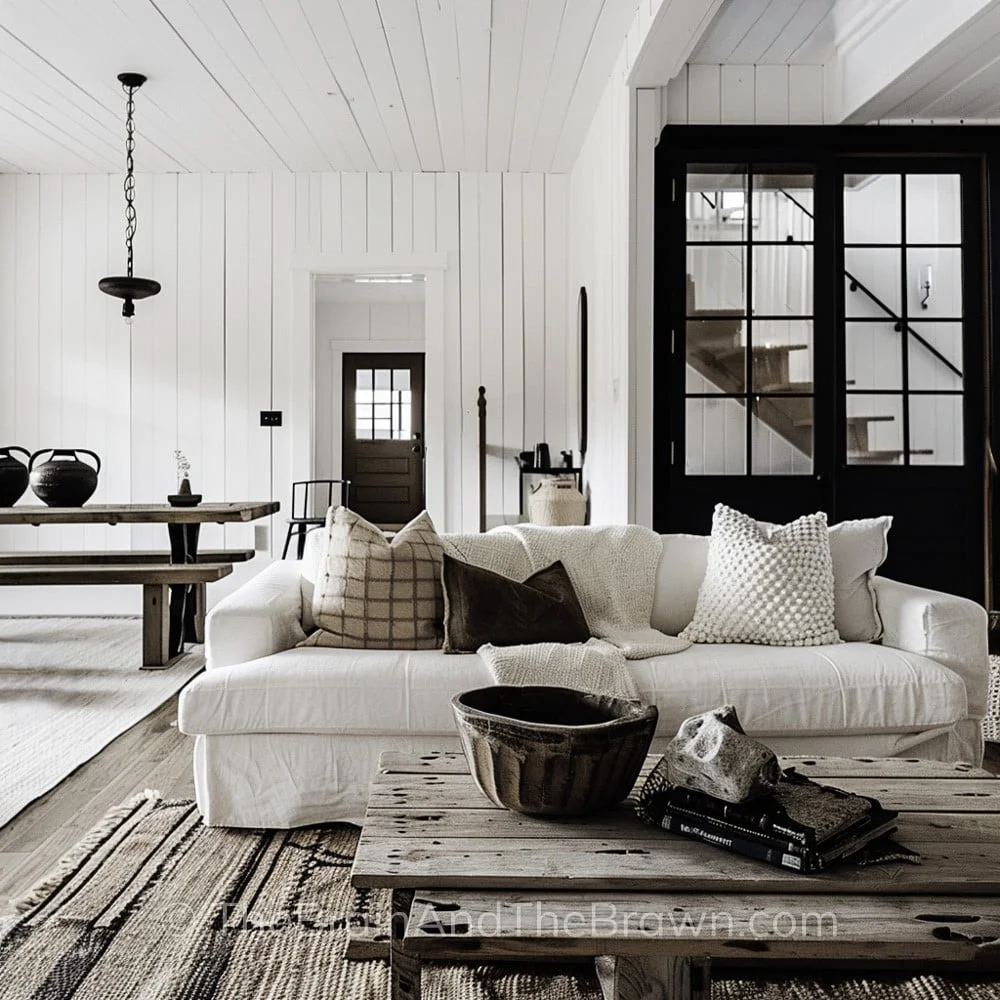 This design is a masterclass in using “weighty” elements, like the dark beams and heavy table, to create a sense of permanence and luxury. The bright pillows and white sofa keep the room feeling cheerful and balanced.