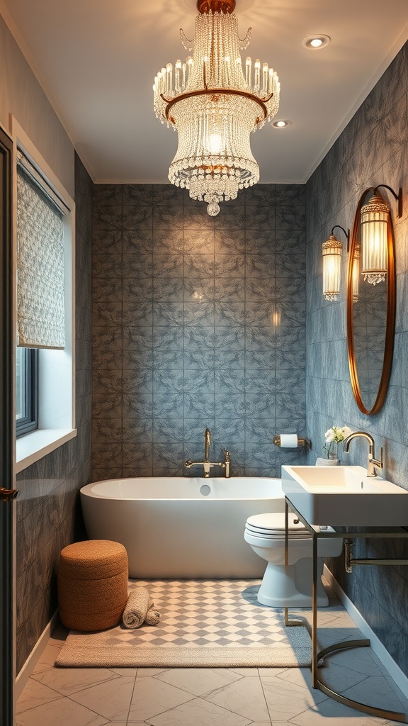 The overhead chandelier complements the bold theme, bringing in a touch of elegance to the overall design. With the right lighting, even a small ensuite can feel open and airy, making it a cozy retreat.