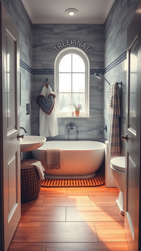 The walls are adorned with intricate tile designs in soft grey tones, which contribute to a soothing ambiance. This approach allows for creativity, as each tile can tell a story or evoke a particular feeling. Pairing these with a sleek, modern bathtub enhances the overall aesthetic, making the bathroom feel both stylish and inviting.