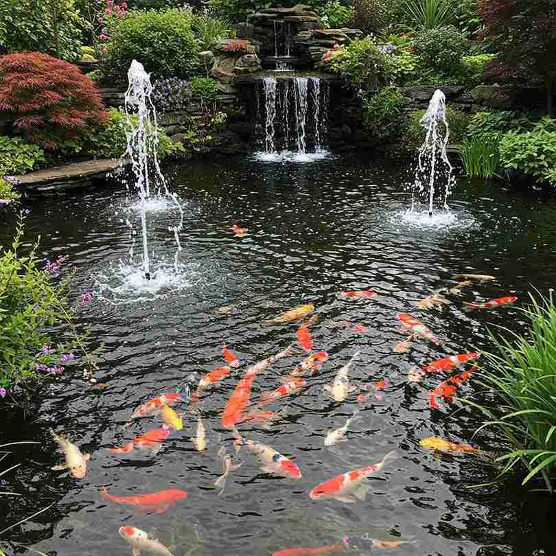 The verticality of the fountains adds a lot of “white noise” and movement, which is great for blocking out neighborhood sounds. Using dark rocks for the waterfall helps the white foam of the water and the bright colors of the fish pop.