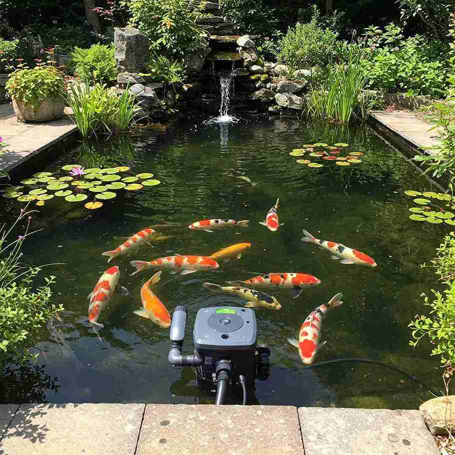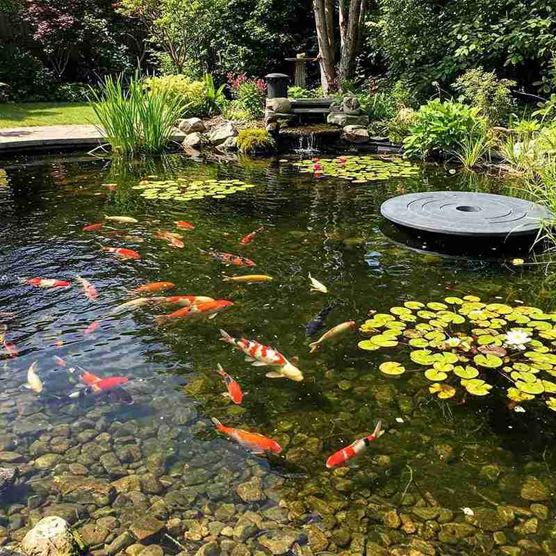 A sprawling, naturalistic pond takes center stage here, filled with rounded river stones and a gentle, low-profile waterfall. Dozens of koi dart between clusters of classic green lily pads, while a modern black filtration disc sits subtly on the surface.