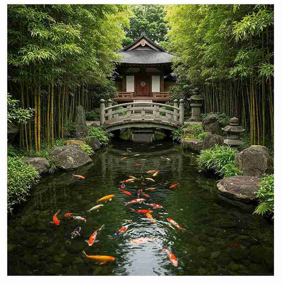 The repetition of the stones creates a rhythmic walking path that encourages you to take slow, intentional steps. The bridge acts as a perfect “lookout” point to see the fish from a different perspective.