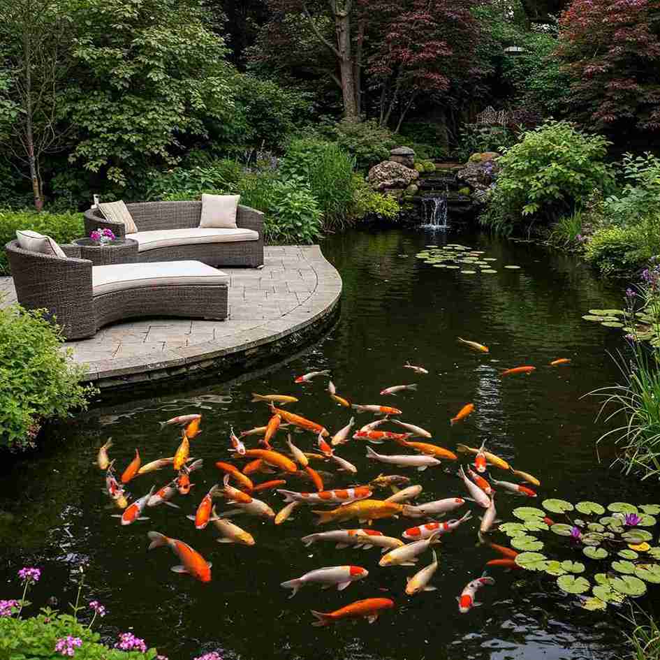 The curve of the furniture mimics the curve of the pond’s edge, creating a very harmonious and intentional flow. It prioritizes comfort, allowing you to lounge with a book while the fish congregate right at your feet.