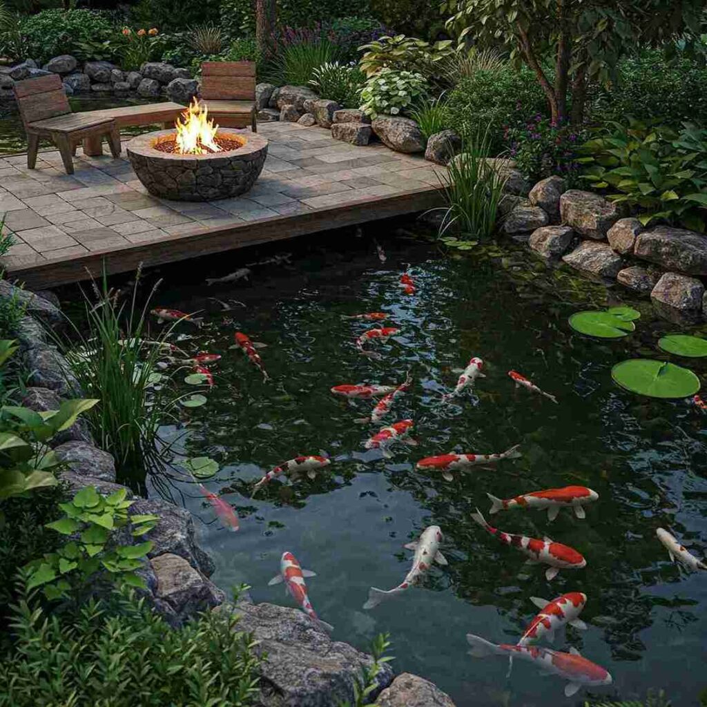 This gorgeous setup features a modern stone fire pit perched on a sleek wooden deck that extends right over the water’s edge. Vibrant koi swim directly beneath the seating area, creating a seamless connection between the warmth of the fire and the cool pond.