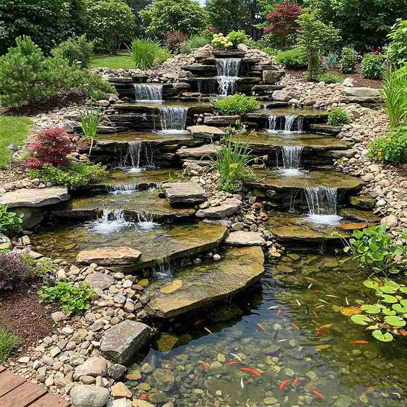 This impressive design features a massive, multi-tiered waterfall built from large, flat flagstones that create a series of wide “sheets” of falling water. The pond at the bottom is shallow and clear, allowing every pebble on the floor to be seen.